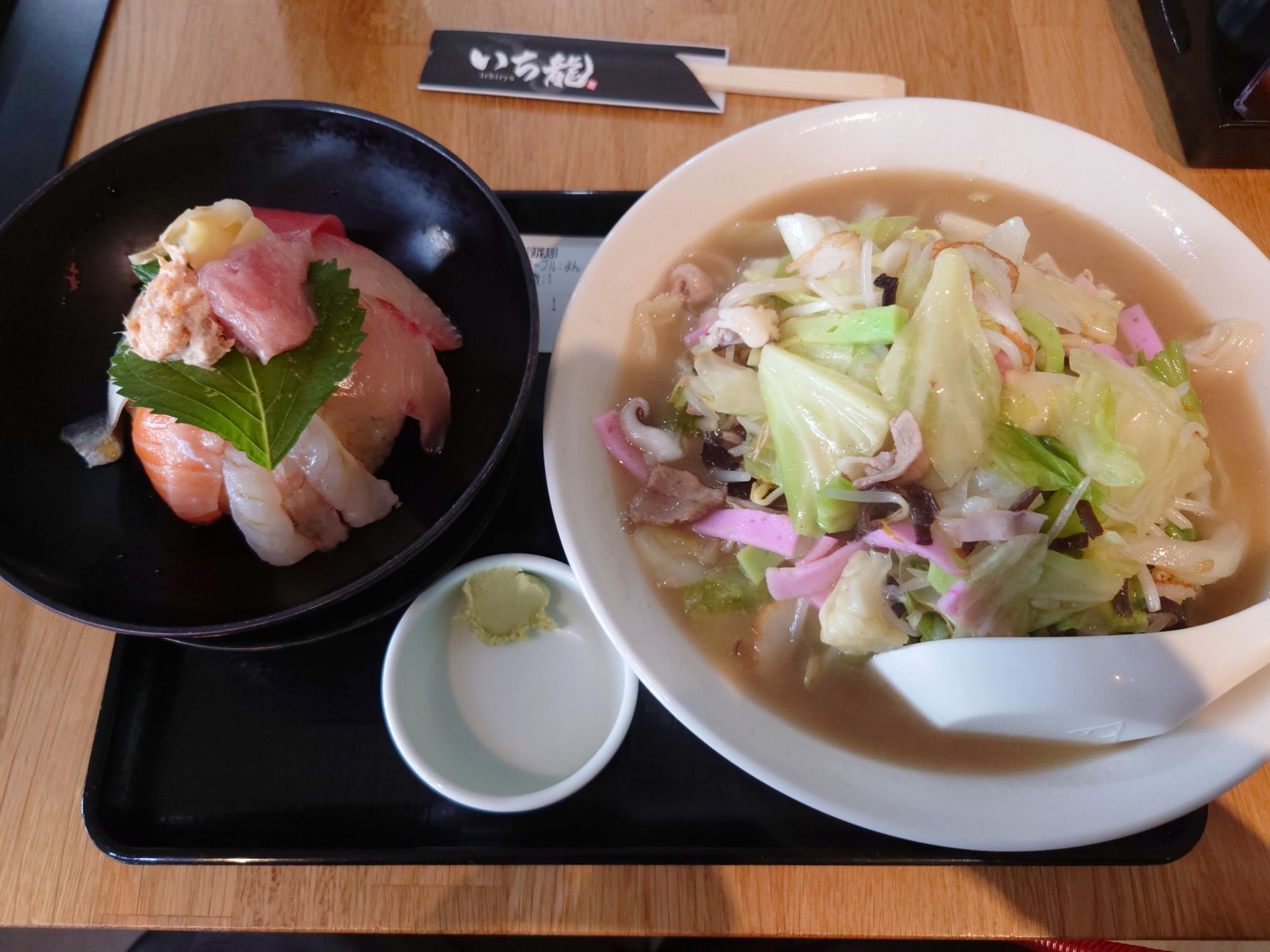 海鮮丼(ミニサイズ)と小浜ちゃんぽん(大盛りサイズ)セットを注文です。