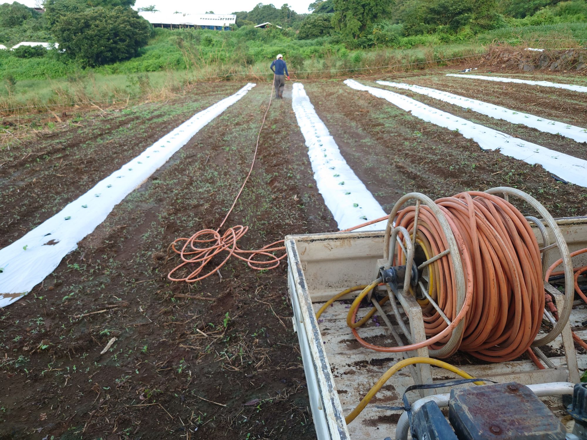 午前の作業は防除と、石拾いと、牛糞を広げる作業と、石の発掘です。