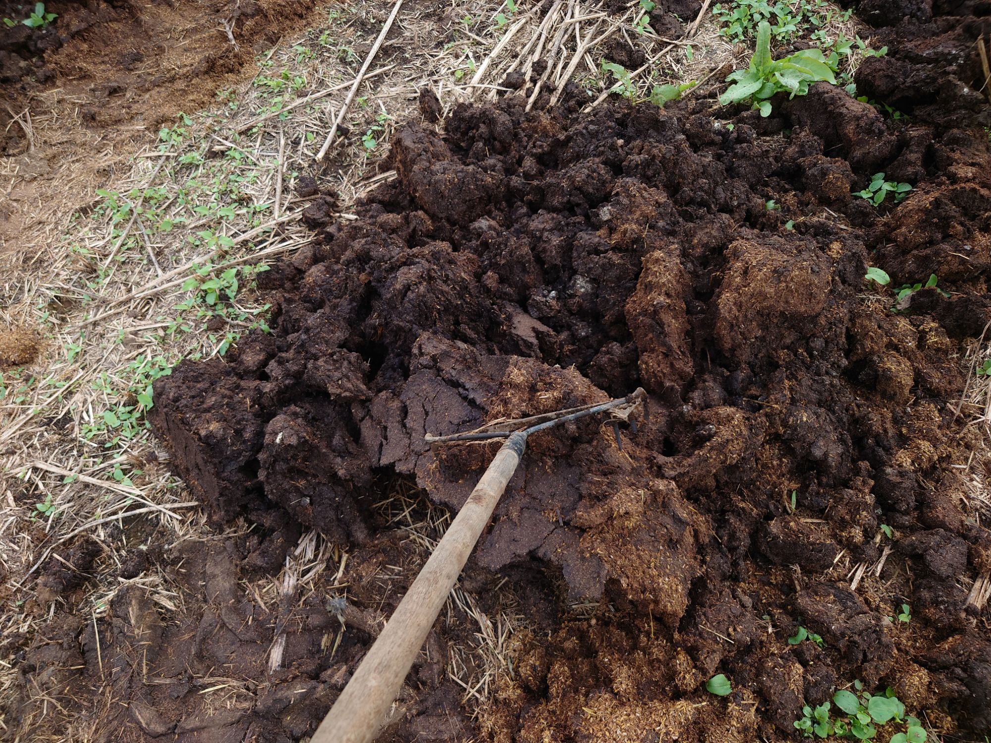 牛糞が塊で撒かれていたので、それを広げてほしいと言う指示が専務から来たので、レーキを使って牛糞を広げていきました。