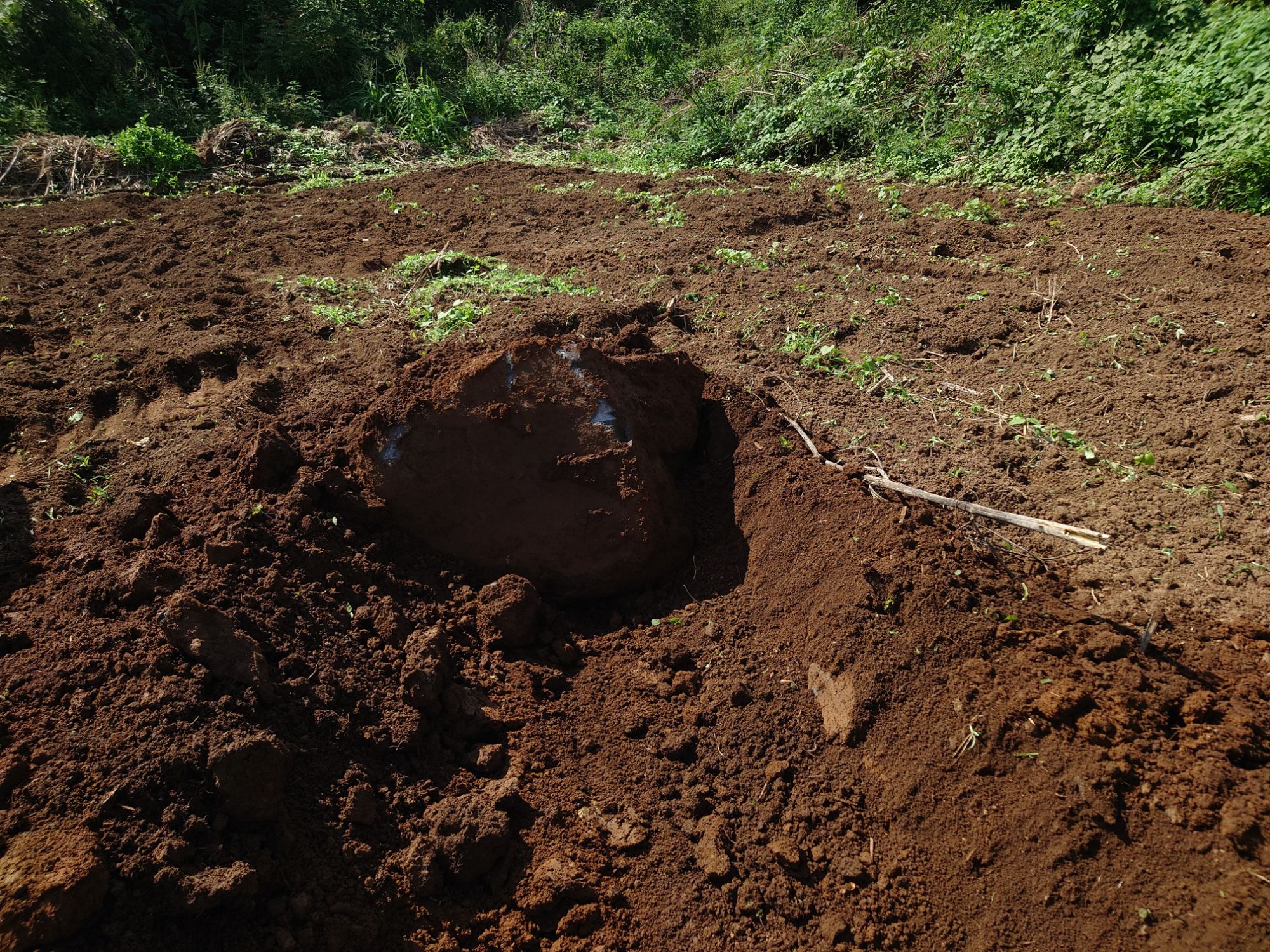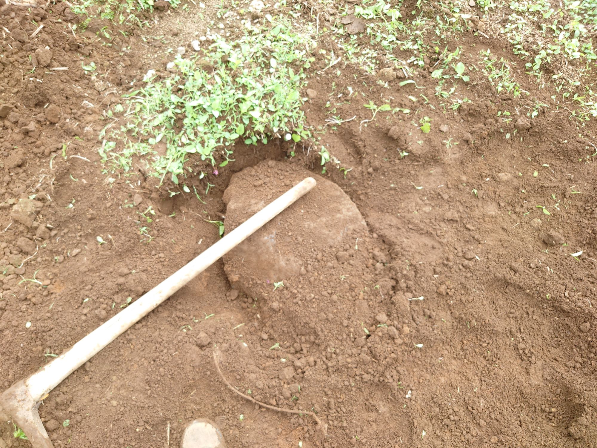 午後の作業は石の発掘と、石拾いと、畑の耕耘と、カボチャの芽かきです。