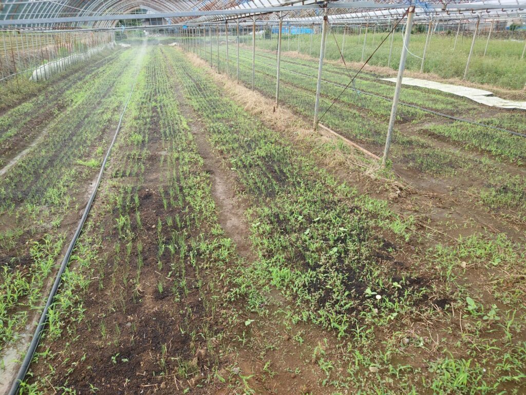 午前の作業は玉ねぎの苗の水やりと、ソルゴー倒しと、草刈です。