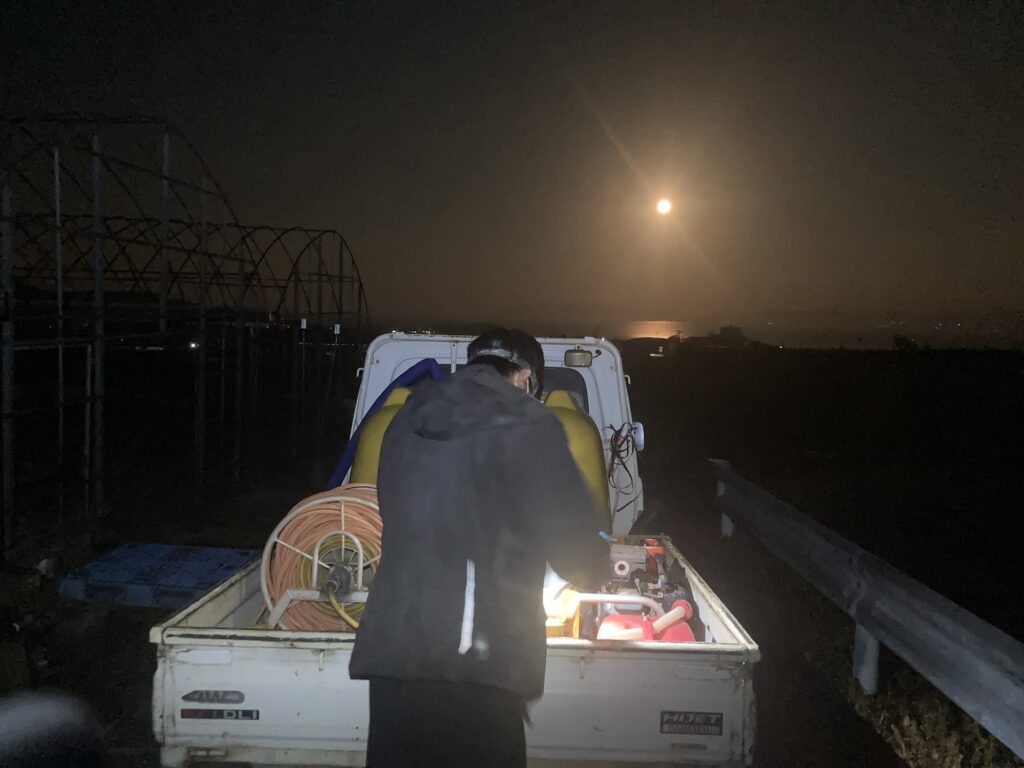 日が昇る前の満月が見えるところで、タンクに水を入れて、社長が薬剤を投入です。