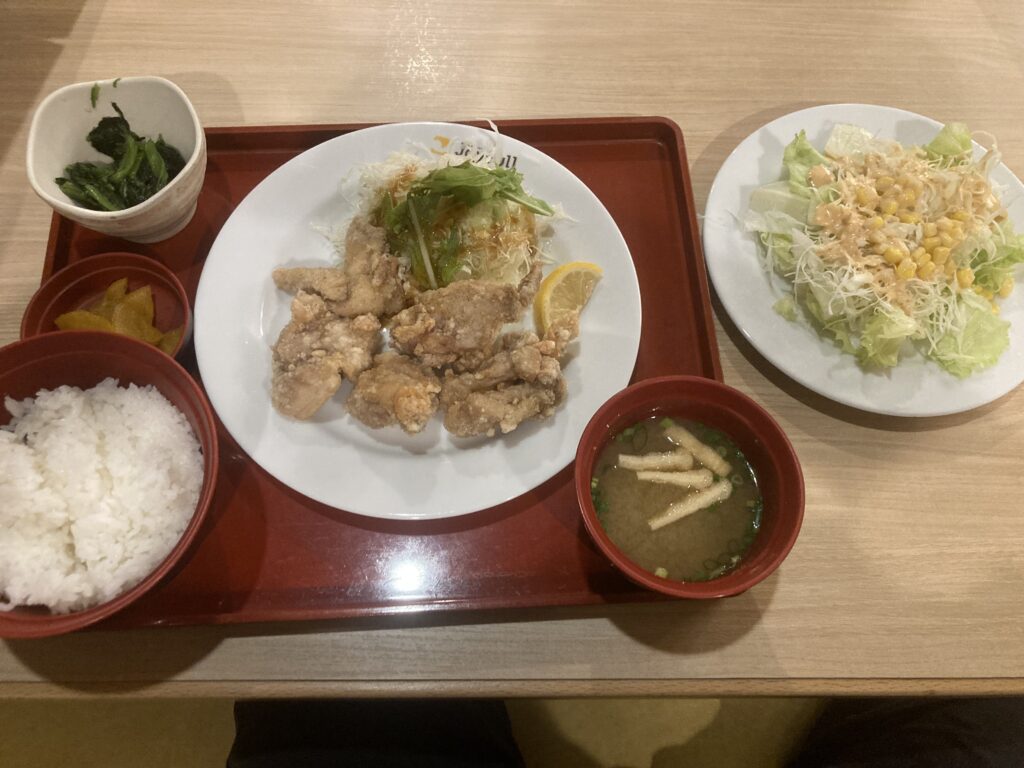 から揚げ定食ご飯大盛とサウザンサラダを注文です。