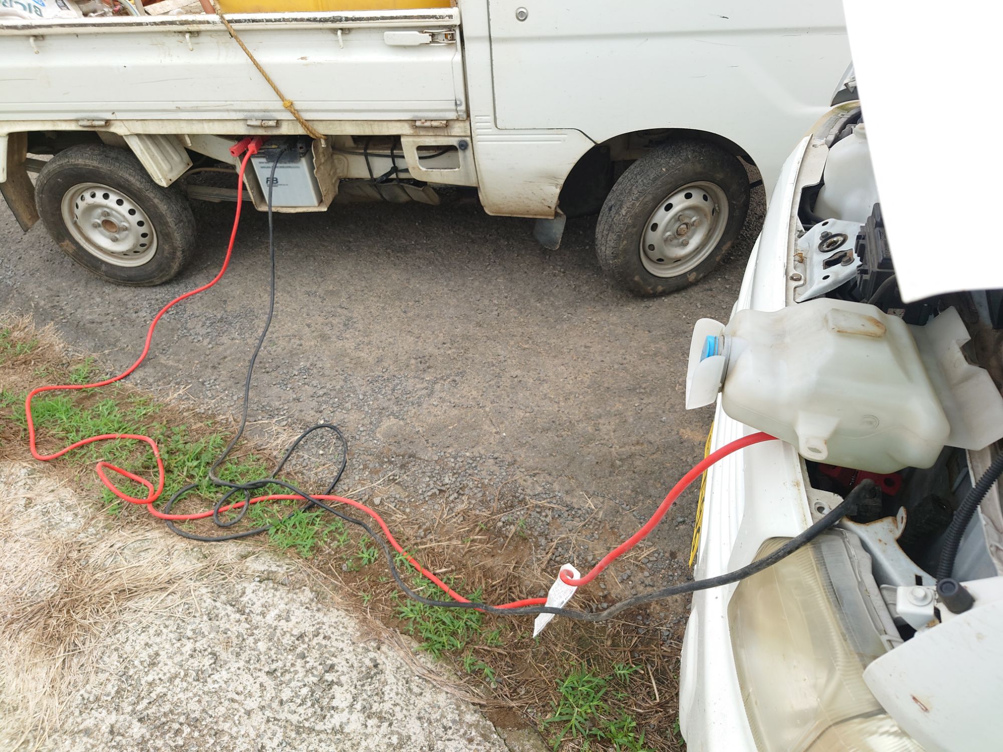 昨日、軽トラのバッテリーを上げてしまったので、ケーブルを繋げて、バッテリーを回復させます。