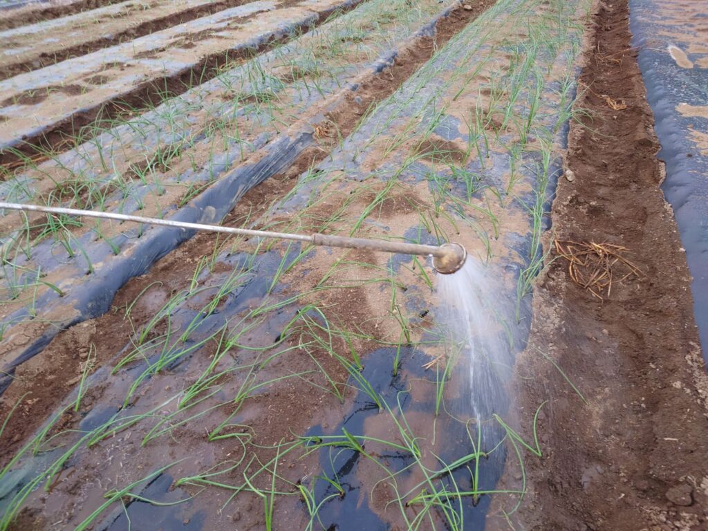4人で定植した玉ねぎに、専務が水やりをしました。