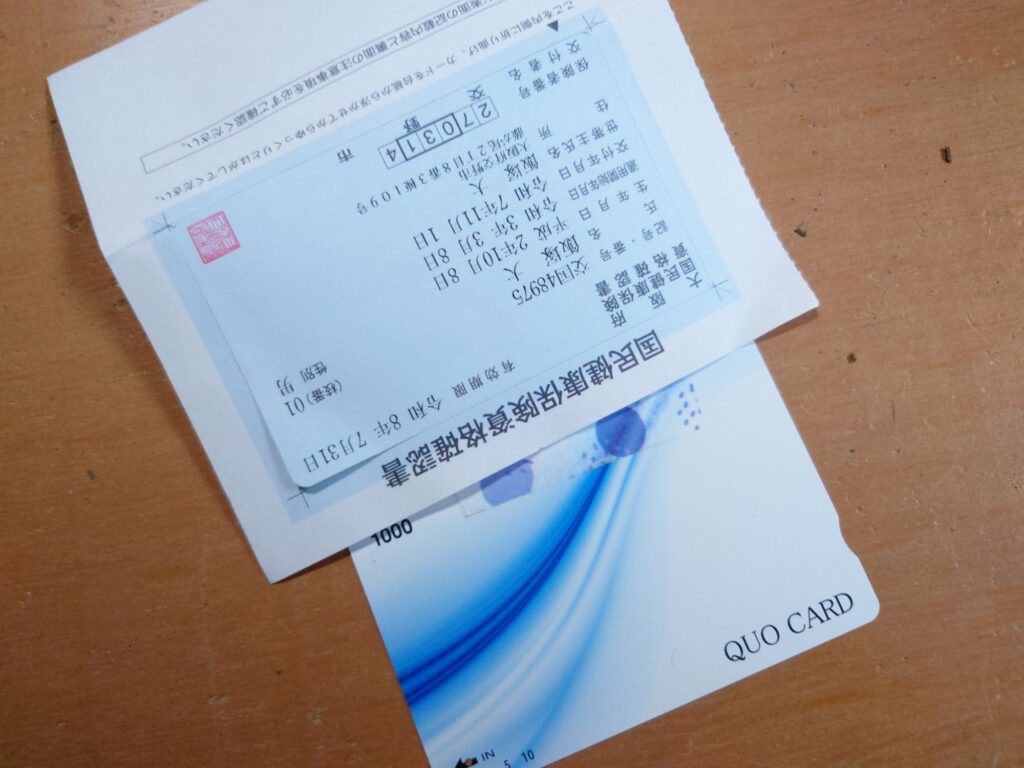 カズミさんから国保を送ってもらうついでにクオカードが送られていきました。