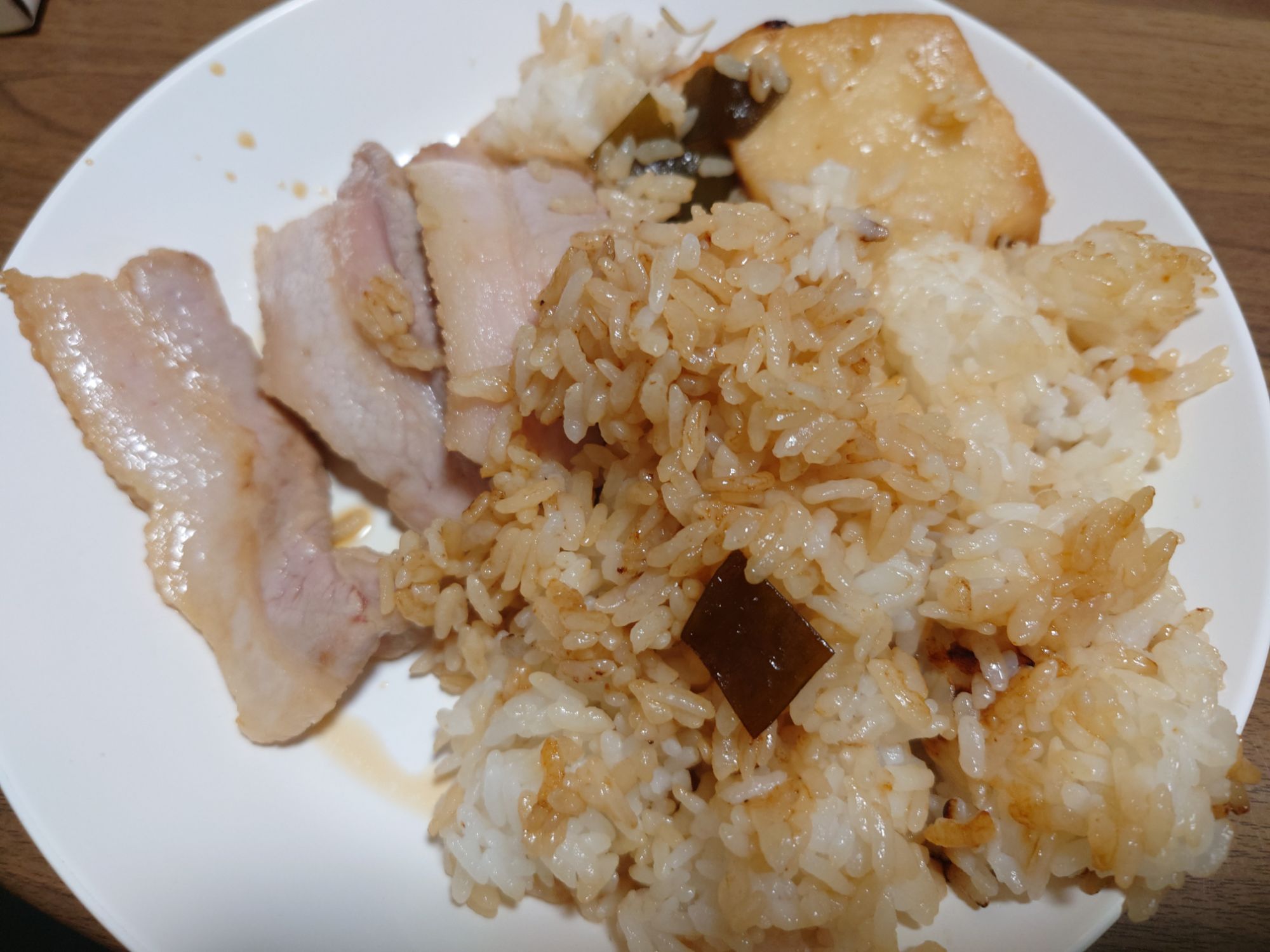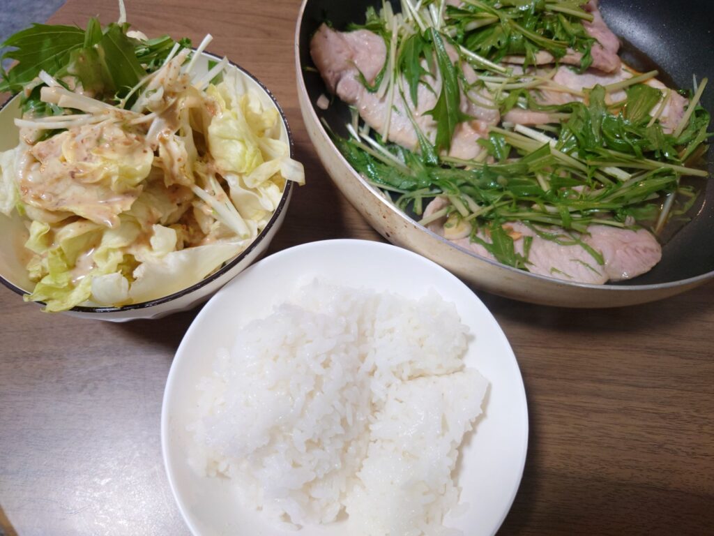 阿武町でのご飯は、米がシェアハウスに置いてあるので、それを炊いて、鈴尾農園から野菜を貰ったのをサラダにして、半額の肉と鈴尾農園の野菜を混ぜたのを食べるという感じになっています。