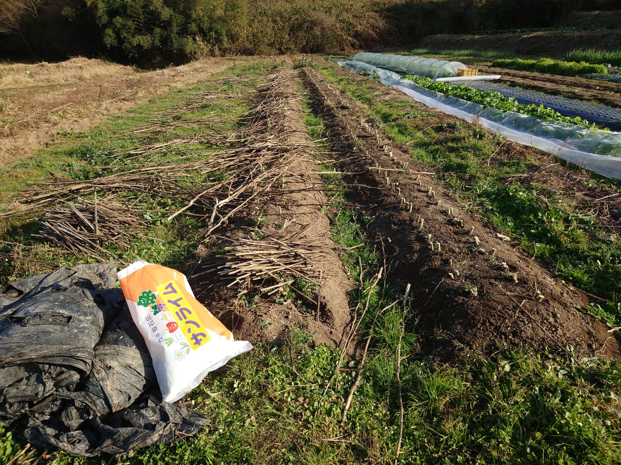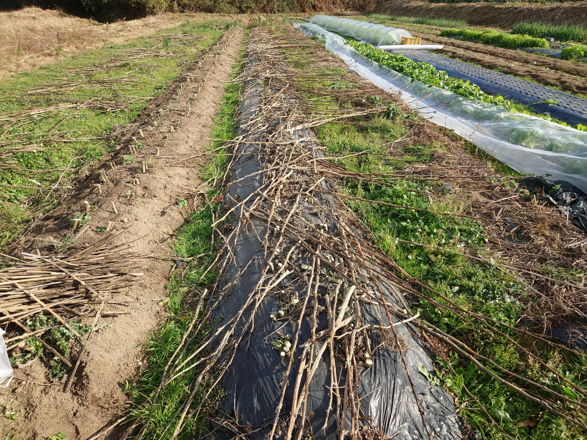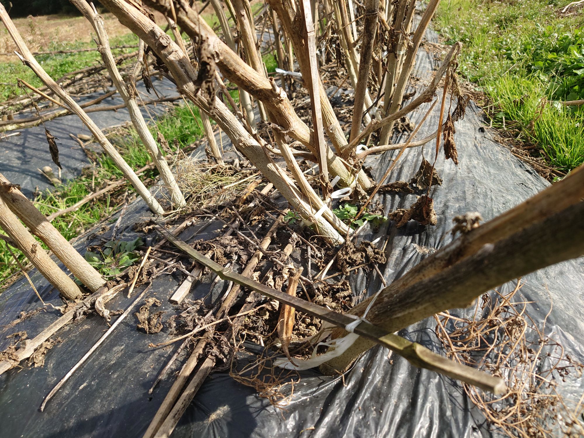 マルチ留めを取ったり、草が邪魔だったので草を刈ったりして、マルチを剥いでいきました。