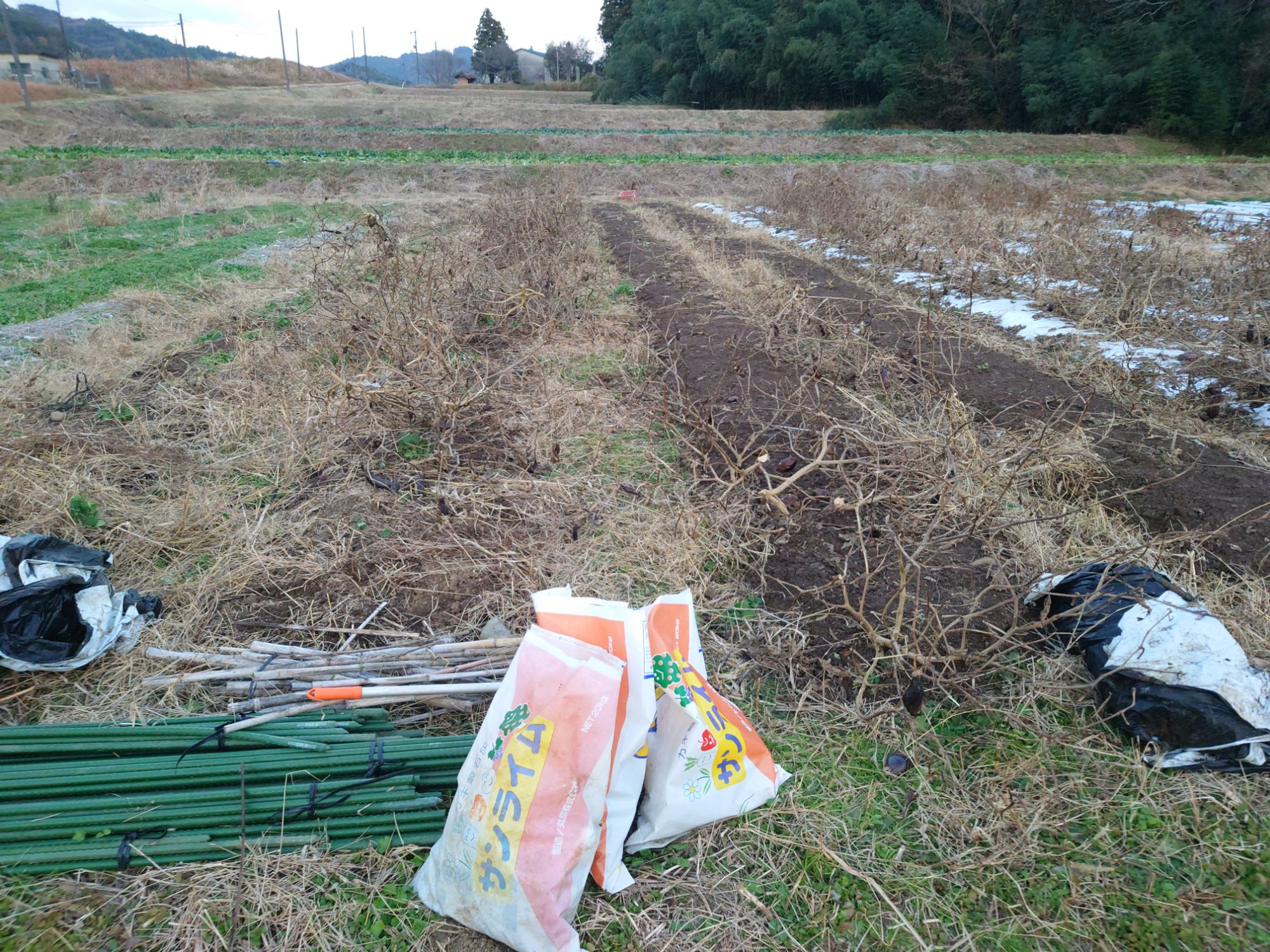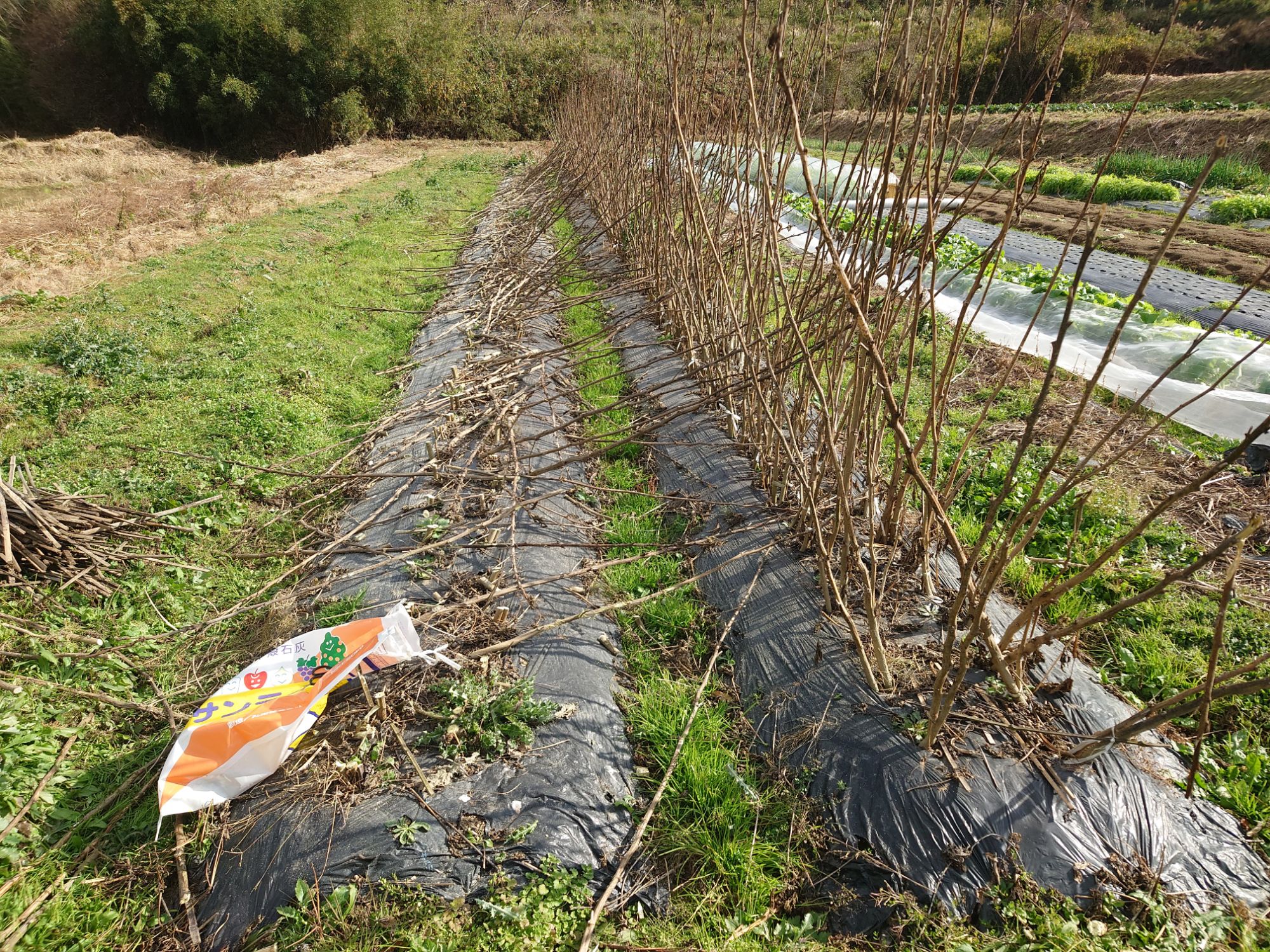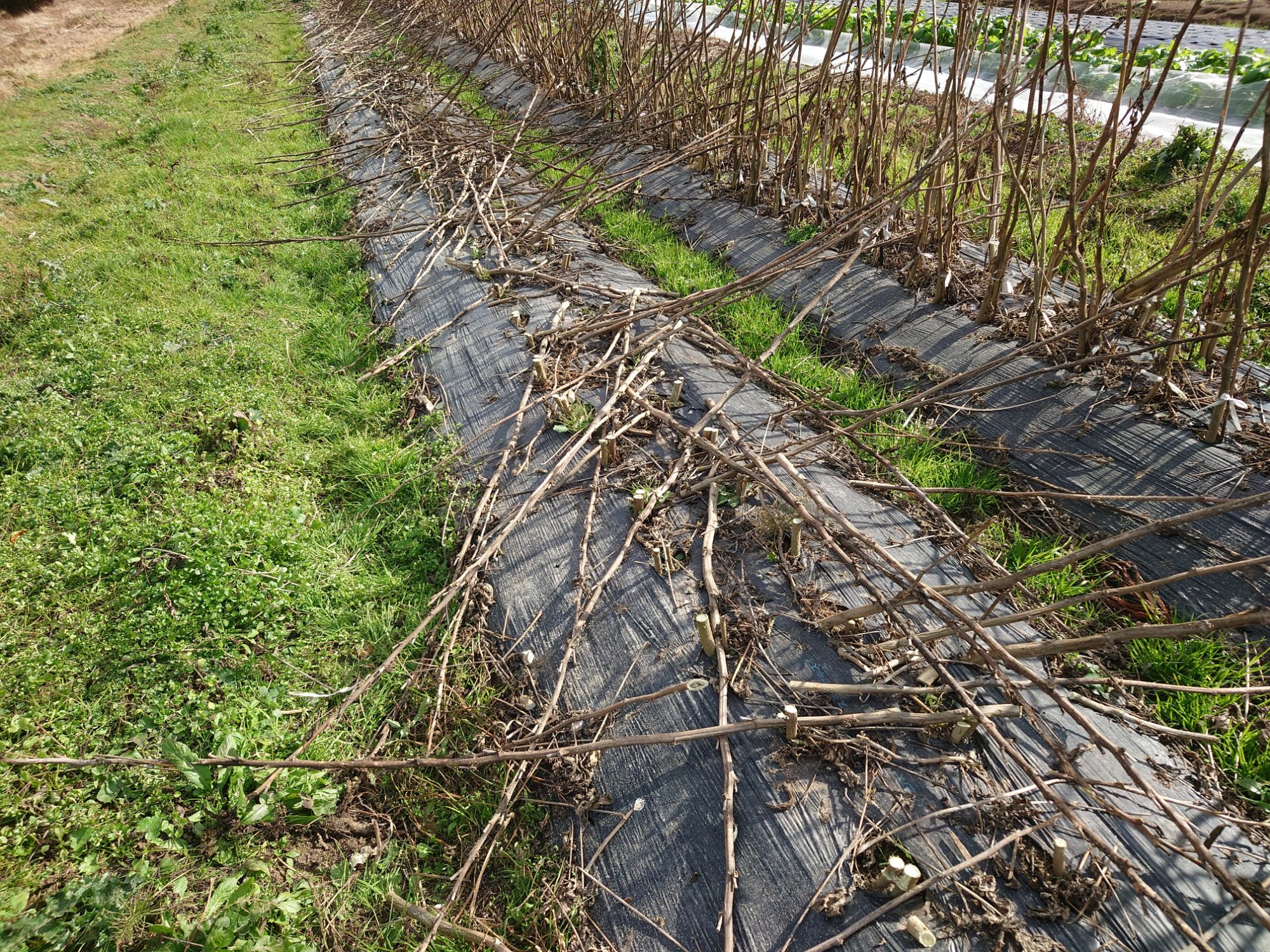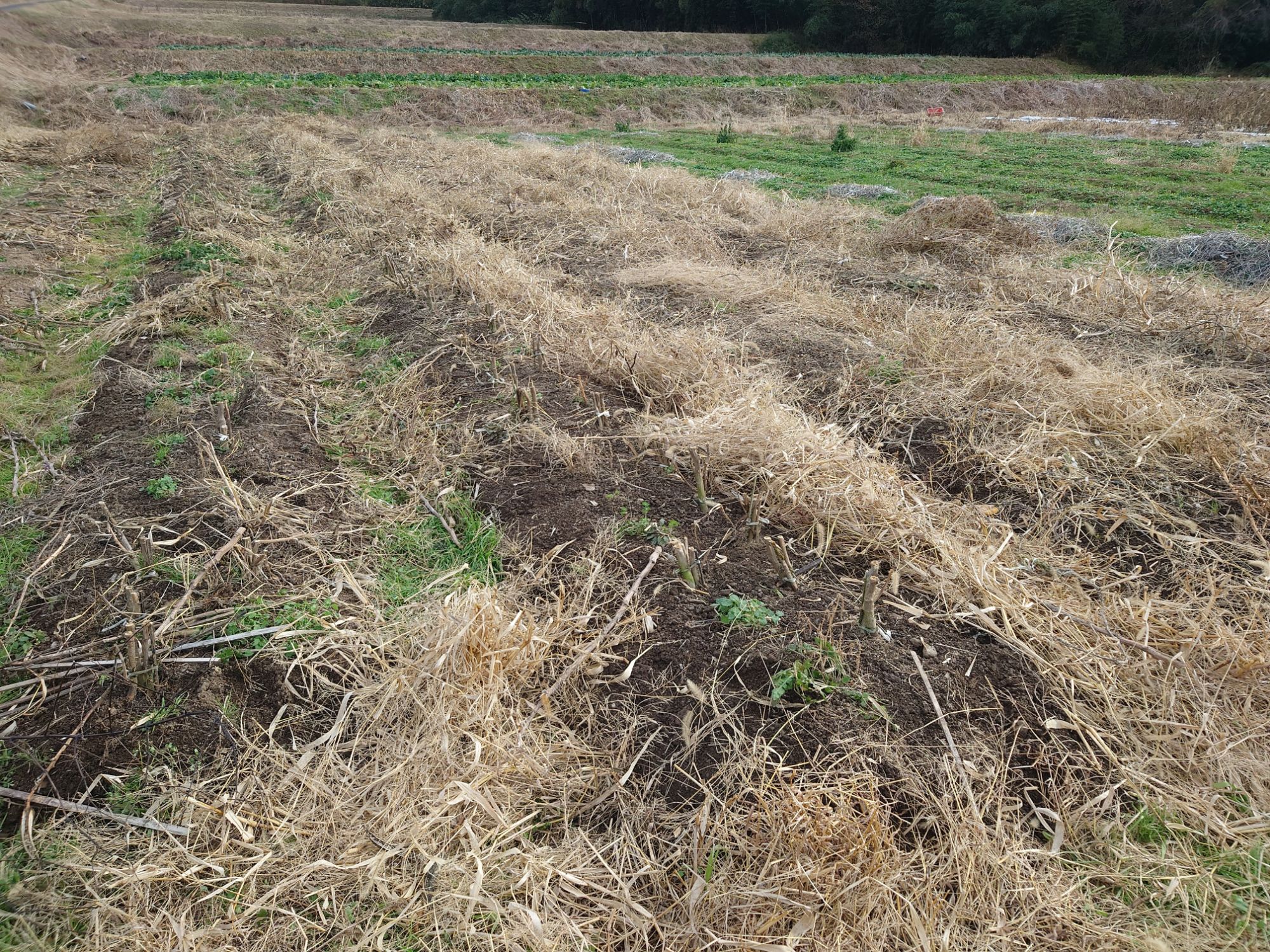 マルチ留めを取ったり、草が邪魔だったので草を刈ったりして、マルチを剥いでいきました。