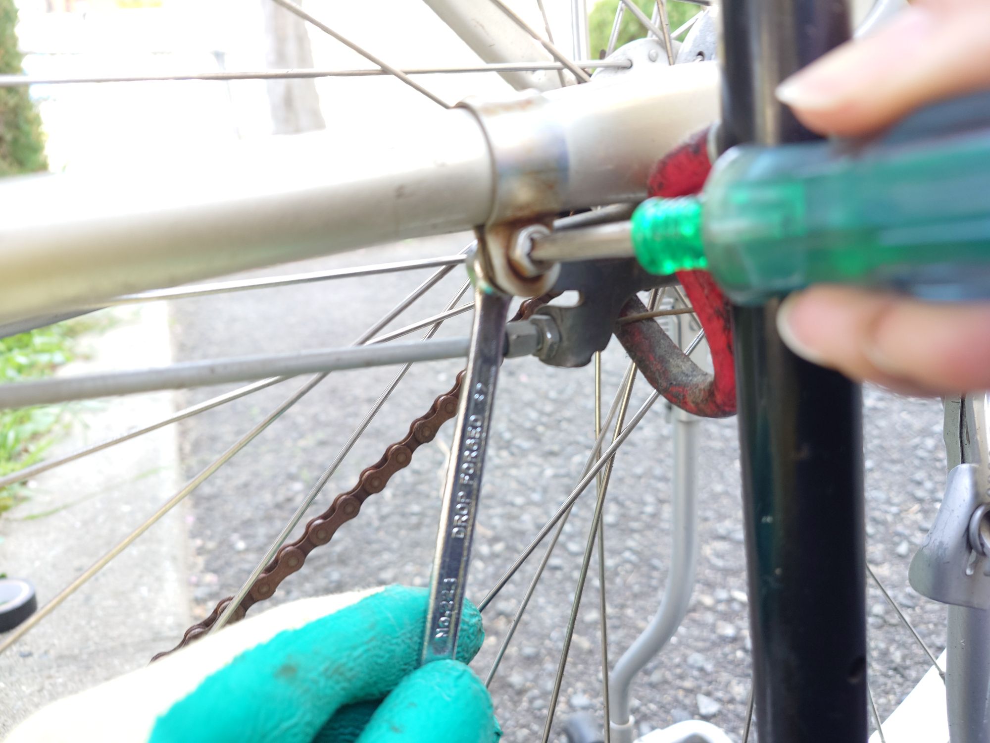 ナットの影響で空回りしていたので、別のプラスドライバーを持ってきて、メガネレンチでナットを抑えながら回していきました。