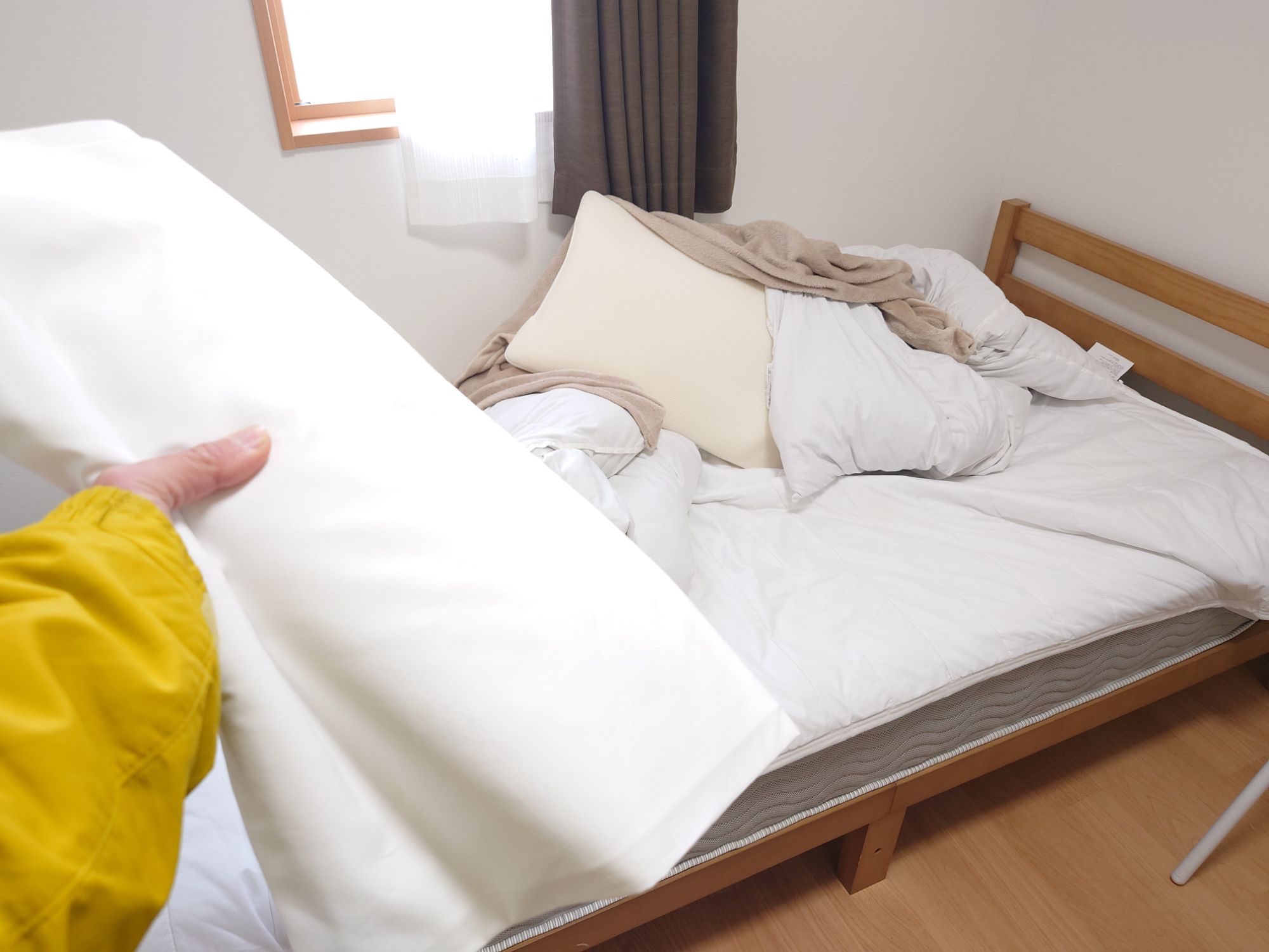 布団のシーツは交換システムで、自分でシーツをかけていきます。