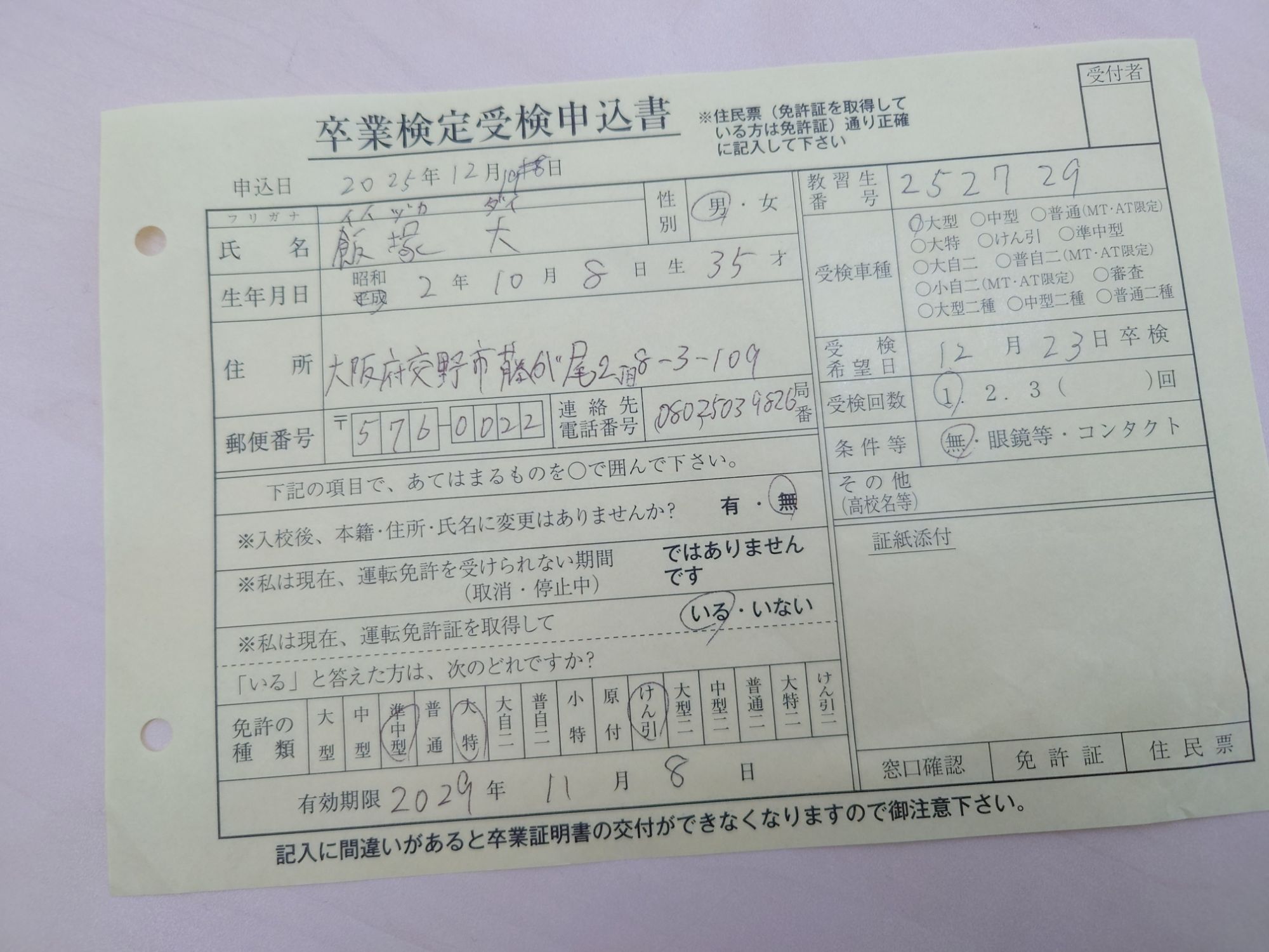 昨日提出したかったのですが、修了検定合格日の次の日以降に出さないといけないというシステムらしく、今日出しました。