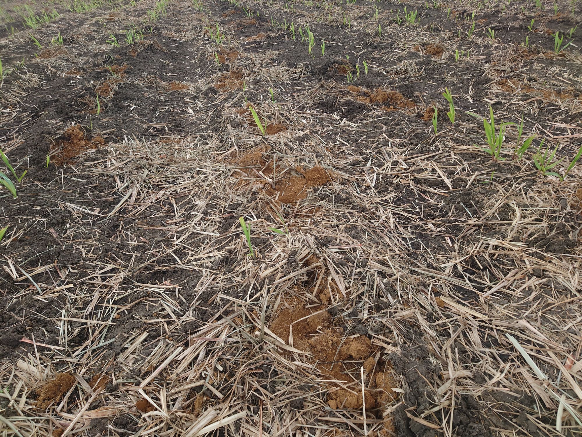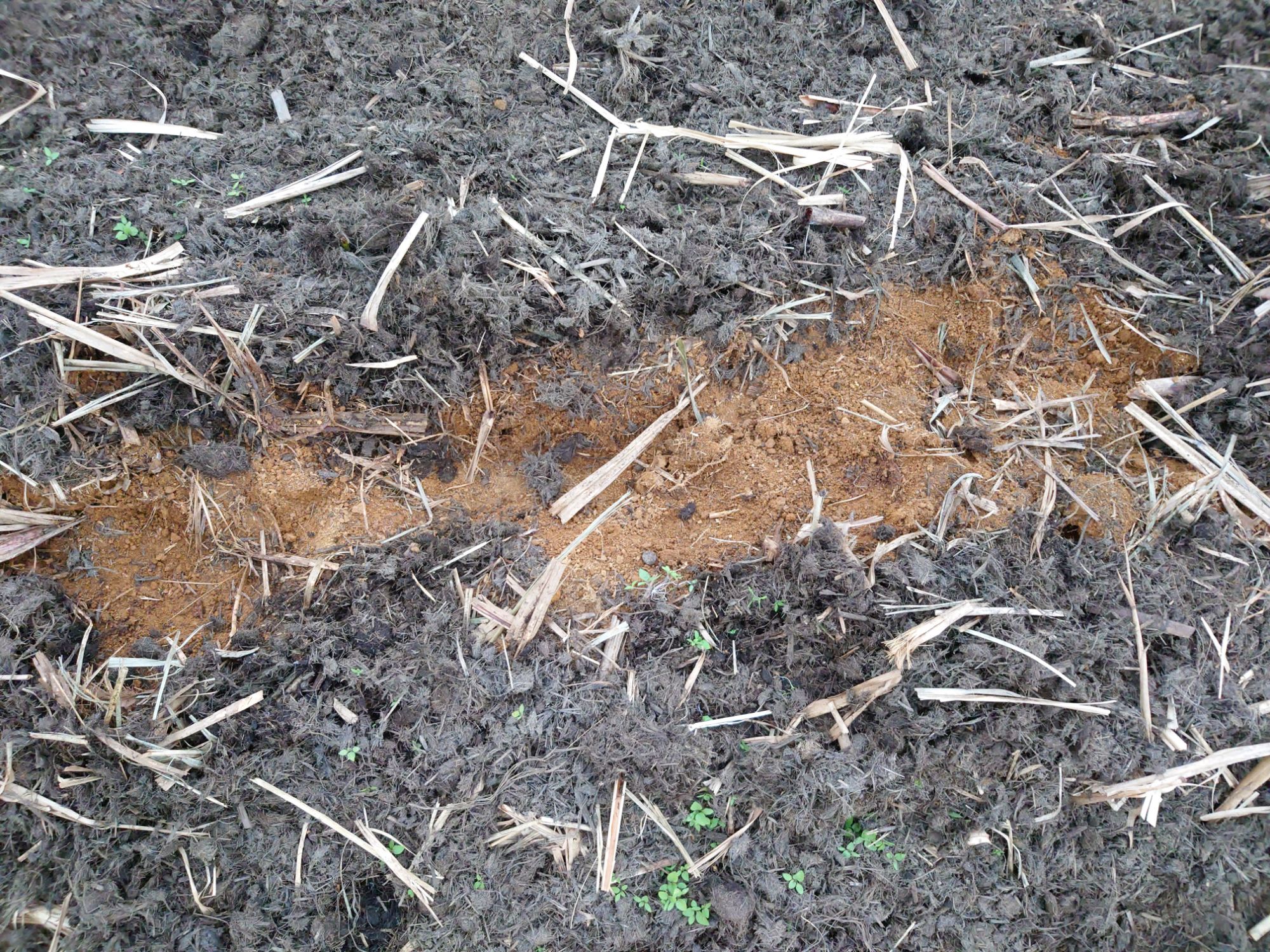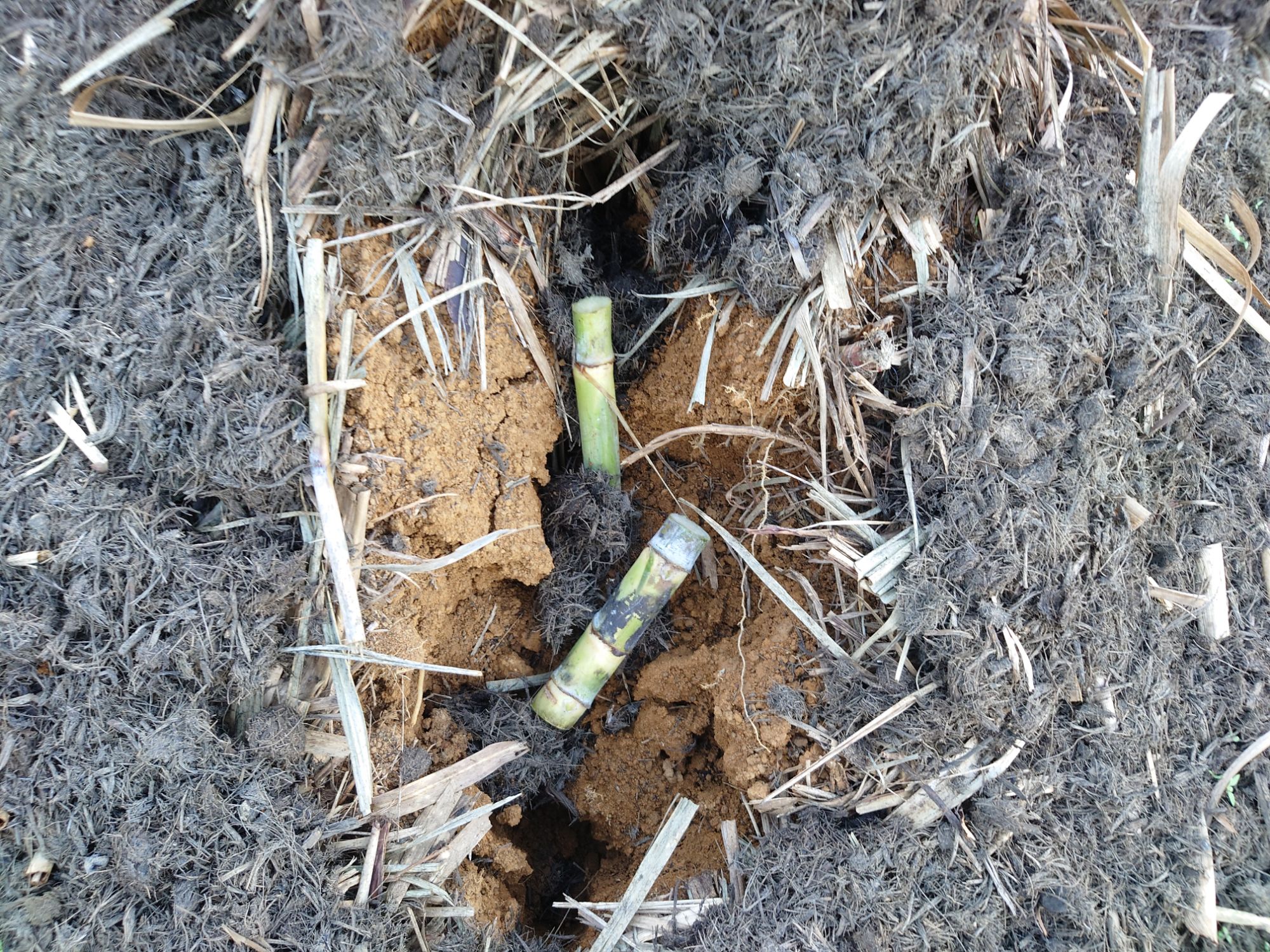 こんな感じに穴に横向きでサトウキビを入れて、足で踏んで、土を被せます。