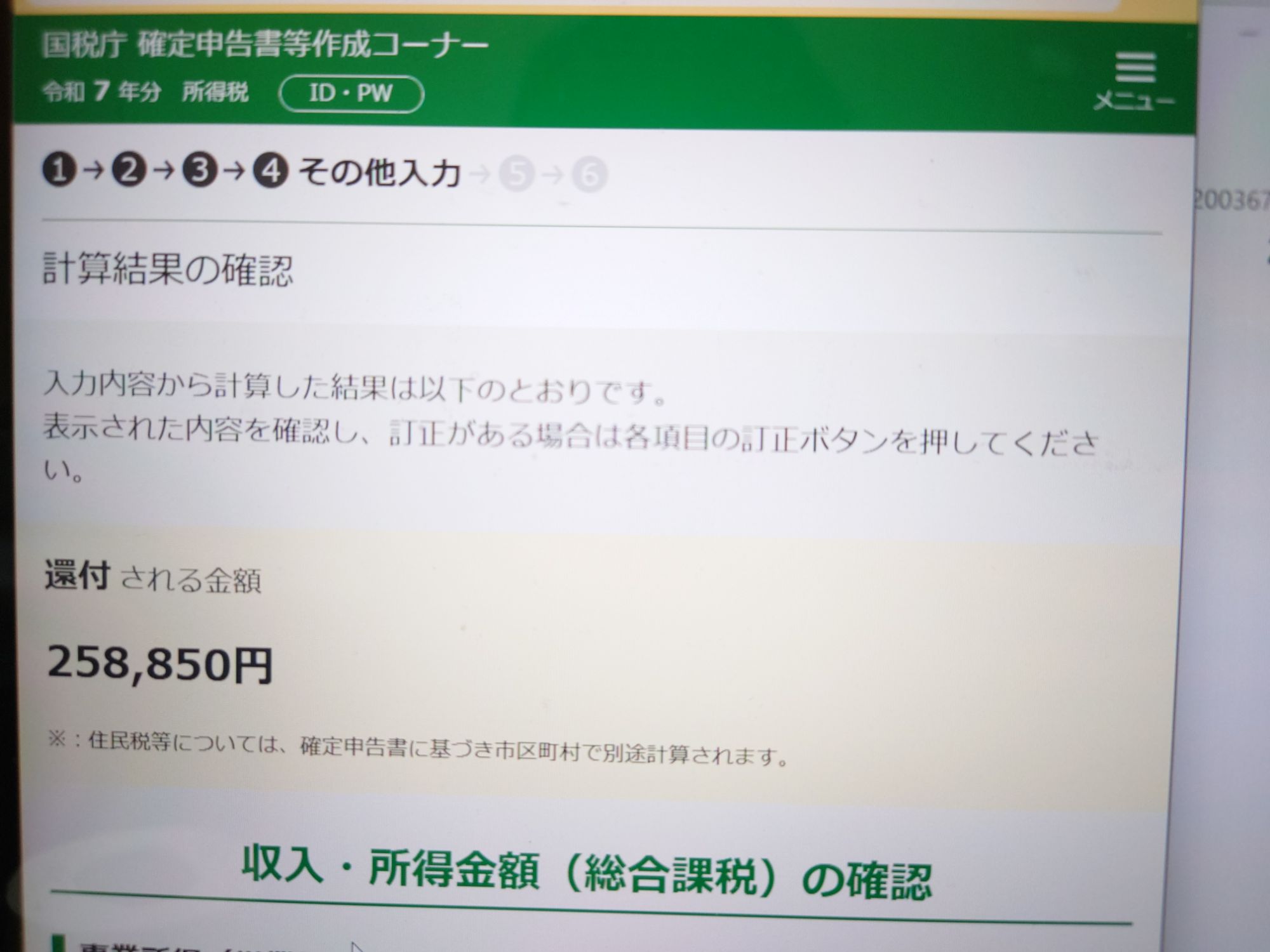 ただ、帳簿付けしなくても、給与所得だけの確定申告で258,850円は普通に還付されていました。