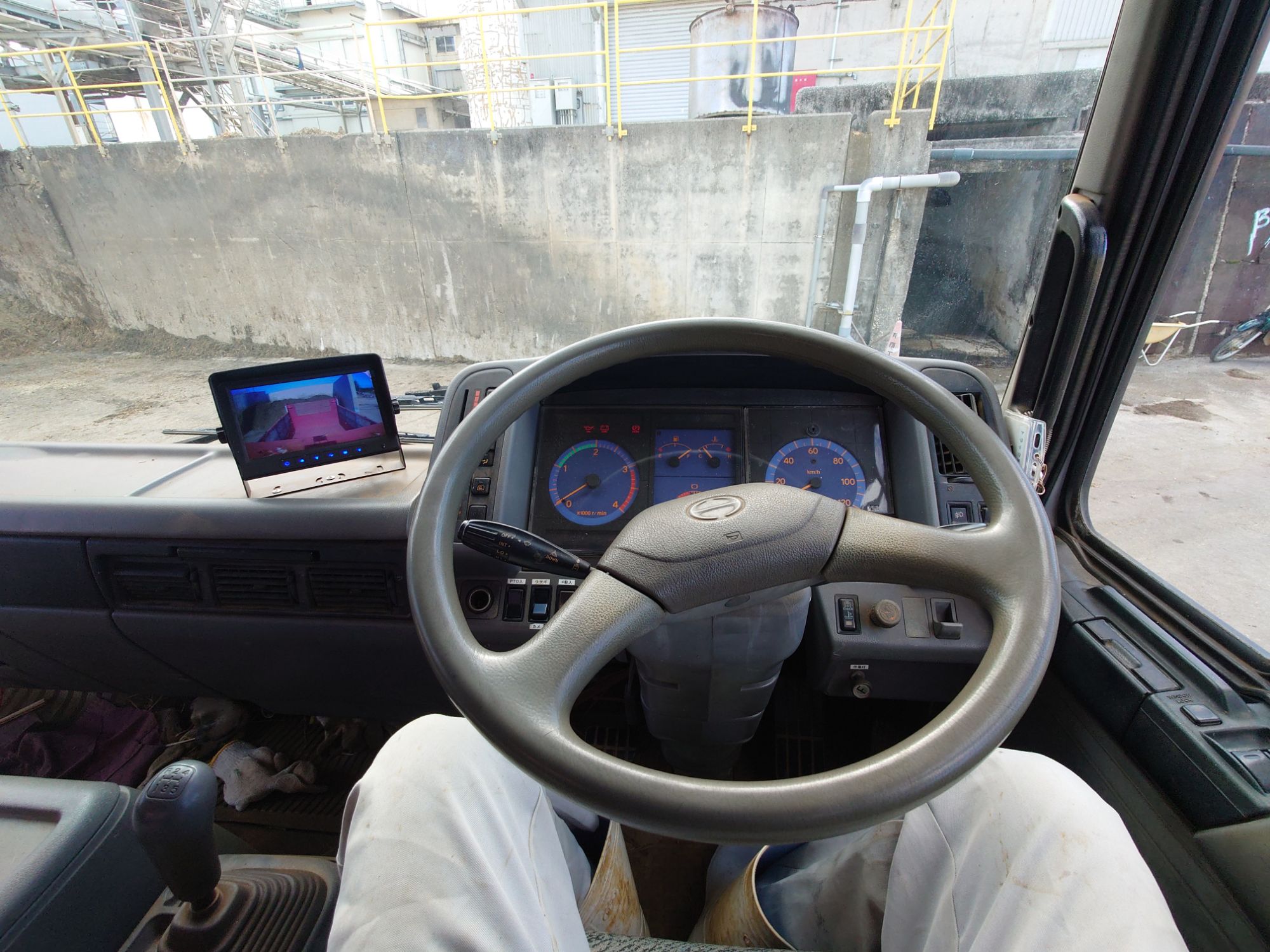 荷台が見えるようにバックモニターがついていて、ホイールローダーでバガスが入れられるのを見れました。
