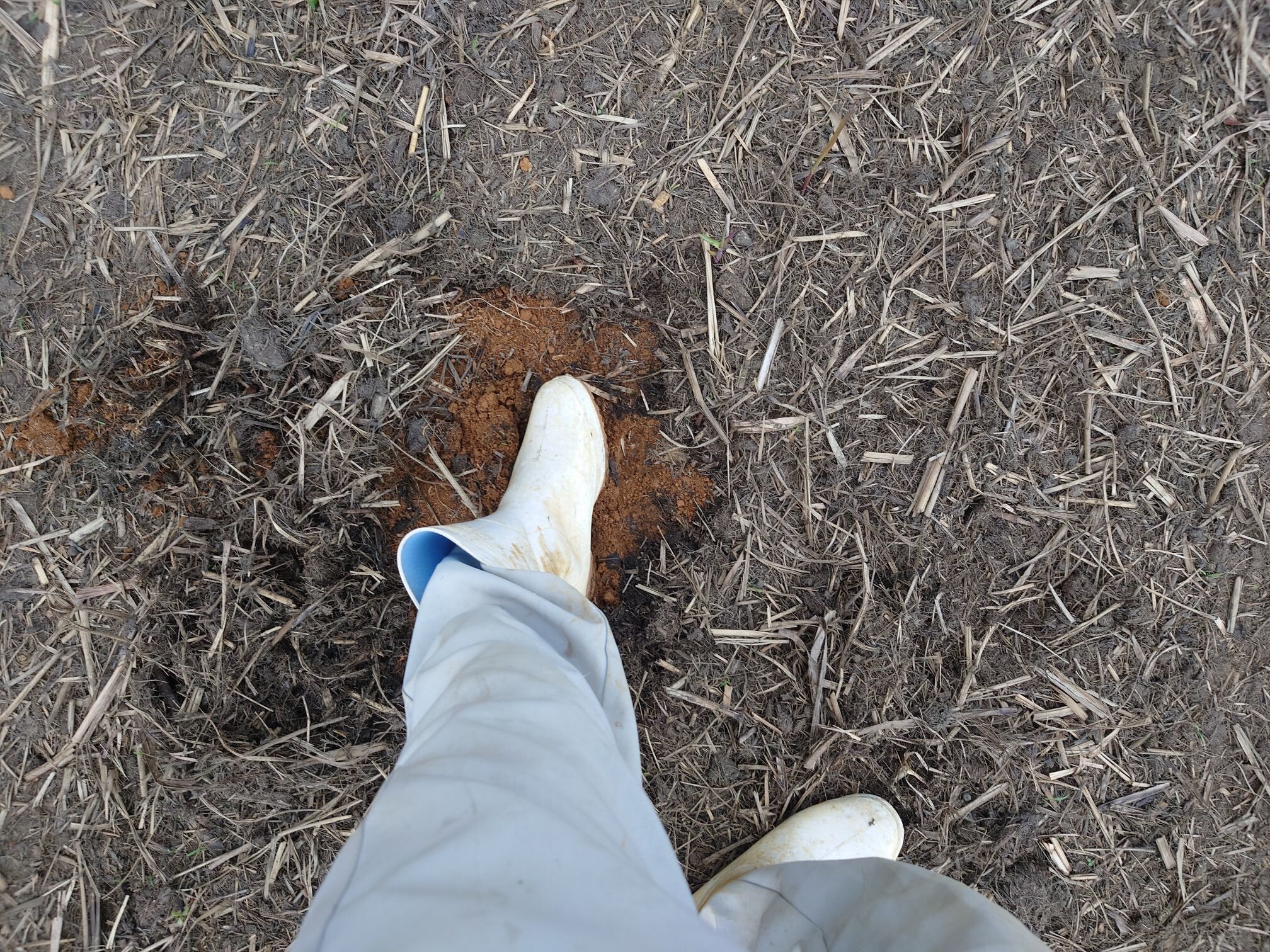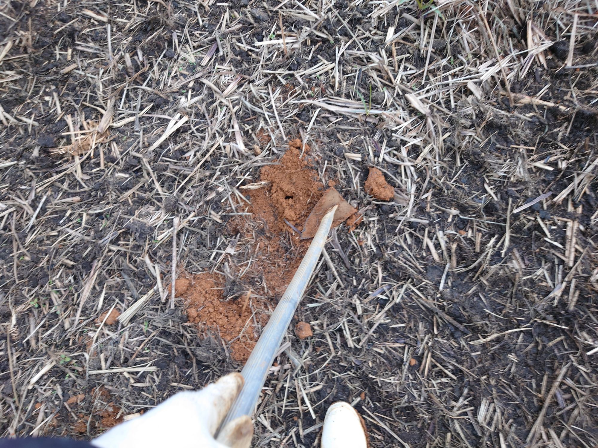 ユンボを使って土を掘るのですが、芽が出ているのが小さすぎて、ユンボに乗ってだとどこから生えているか分からないとのことで、目印を付けていきました。