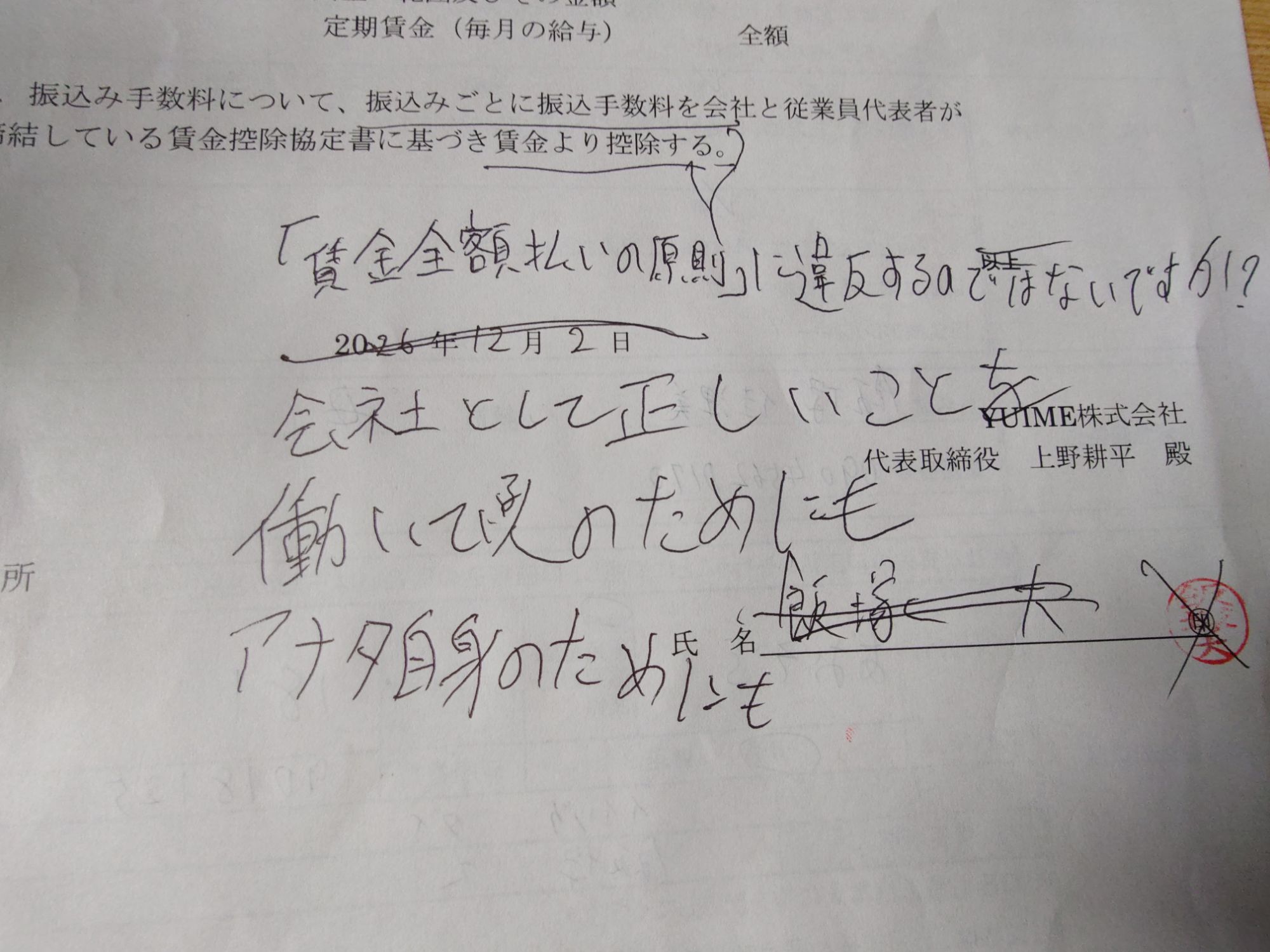 正しいご判断をよろしくお願いいたします』というメールを送ったところ、返信が返ってきていて、『振込手数料が給与から差し引かれることはありません。他のスタッフの方も同様です!』とのことでした。