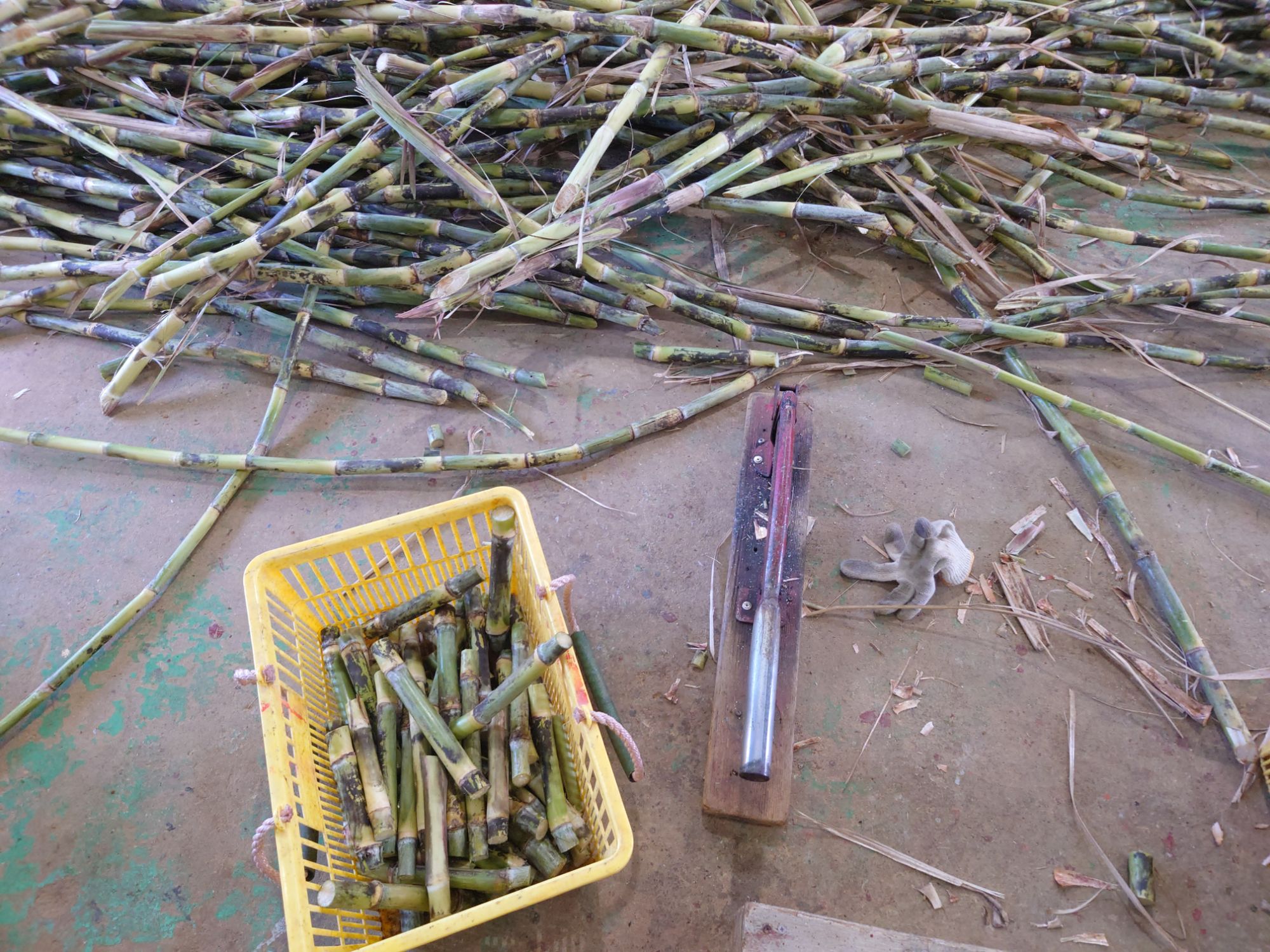 持って帰ってきたサトウキビを補植用に切っていきます。