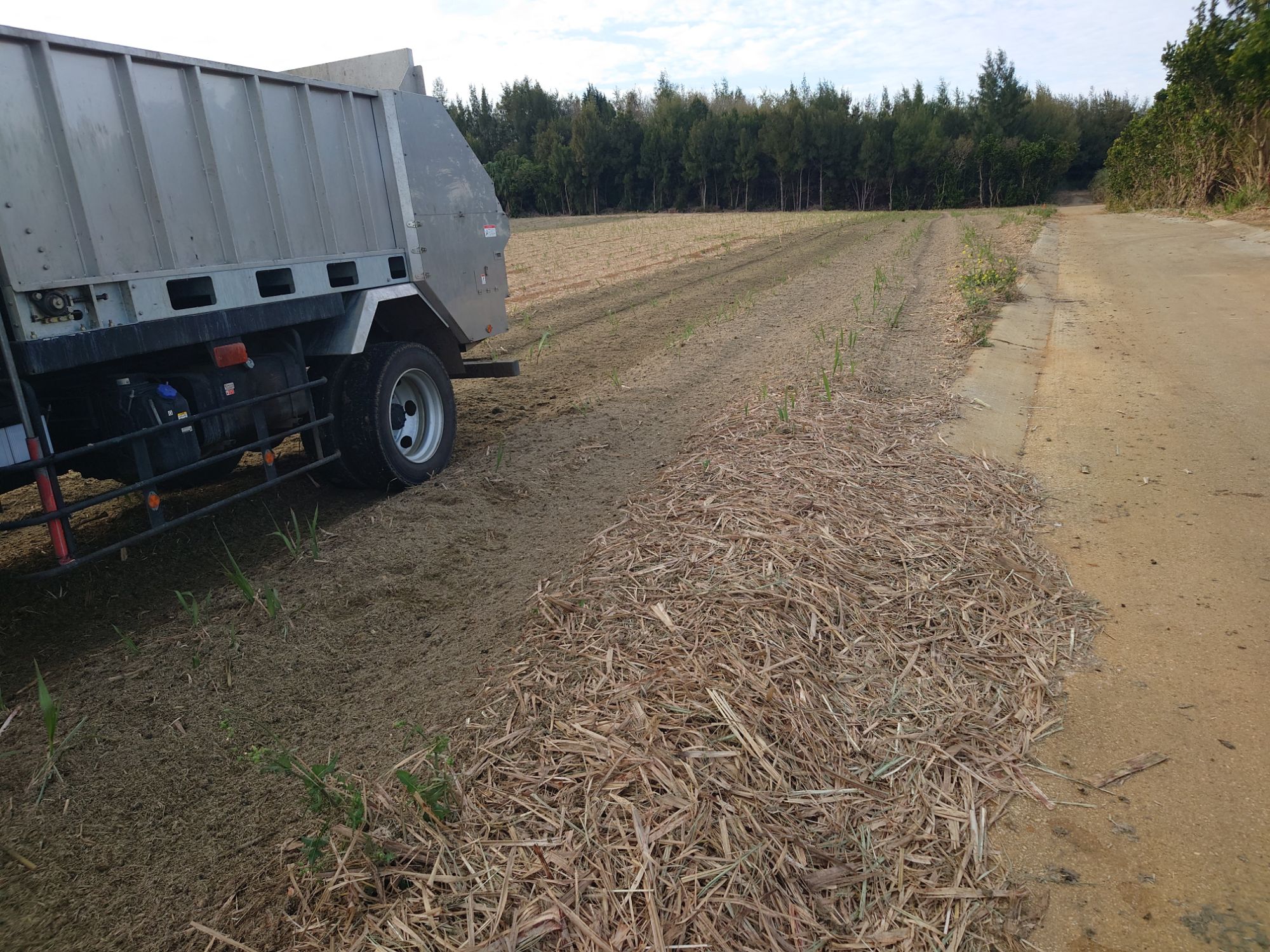 道路沿いの畑は入りやすいですが、撒くのはバガスが道路にはみ出ないようにしないといけない感じです。