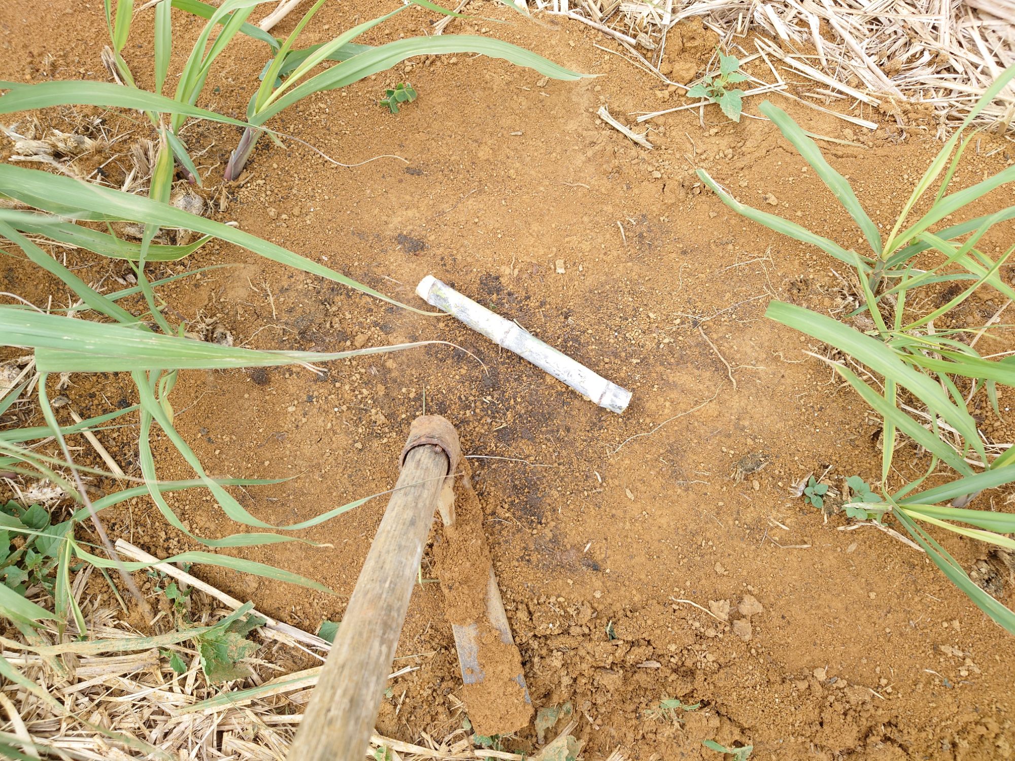 やり方としては、地面を掘って、サトウキビの芽が上に見えるように置いて、土をかぶせるという感じでした。